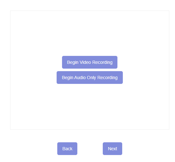 - The question will appear with a ‘Begin Recording’ button on the live survey. The participant need only click the button and record their message directly from their PC, laptop or smart phone, using their camera and microphone.